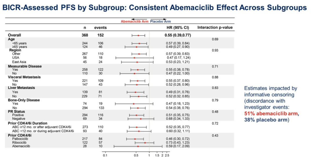在主要的临床和基因组亚组(包括基线时有ESR1或PIK3CA突变的患者)中观察到一致的效应。阿贝西利组的ORR优于安慰剂组(在有可测量疾病的患者中,ORR分别为17%和7%)。根据BICR的PFS也有所改善,HR=0.55(95%CI:0.39~0.77)。OS仍不成熟(20.9%的事件发生率)。安全性与阿贝西利已知的特征一致。