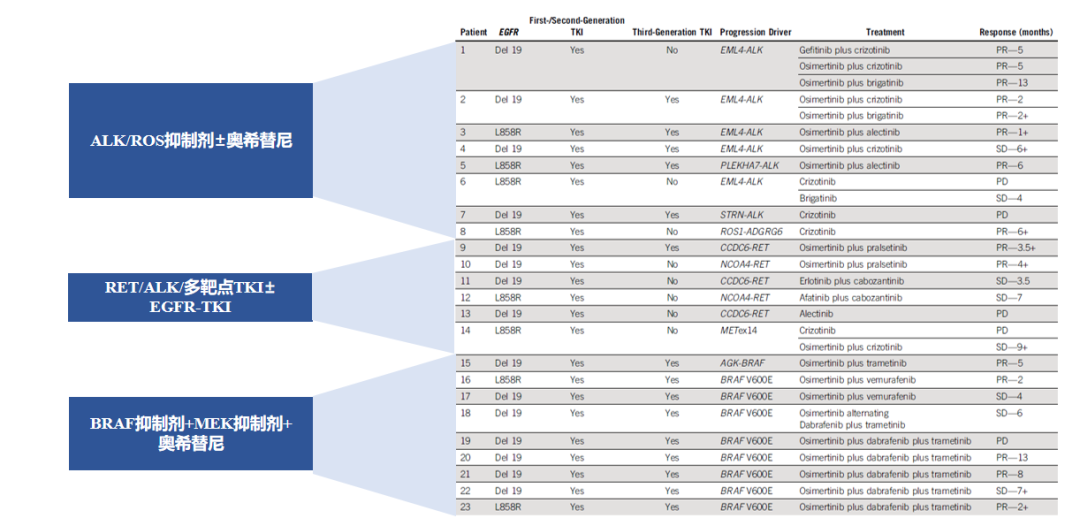 相关通路的靶向药物单药或与EGFR-TKI联合治疗的数据尚在积累中,包括ALK/ROS抑制剂、RET/ALK/多靶点TKI、BRAF抑制剂等。