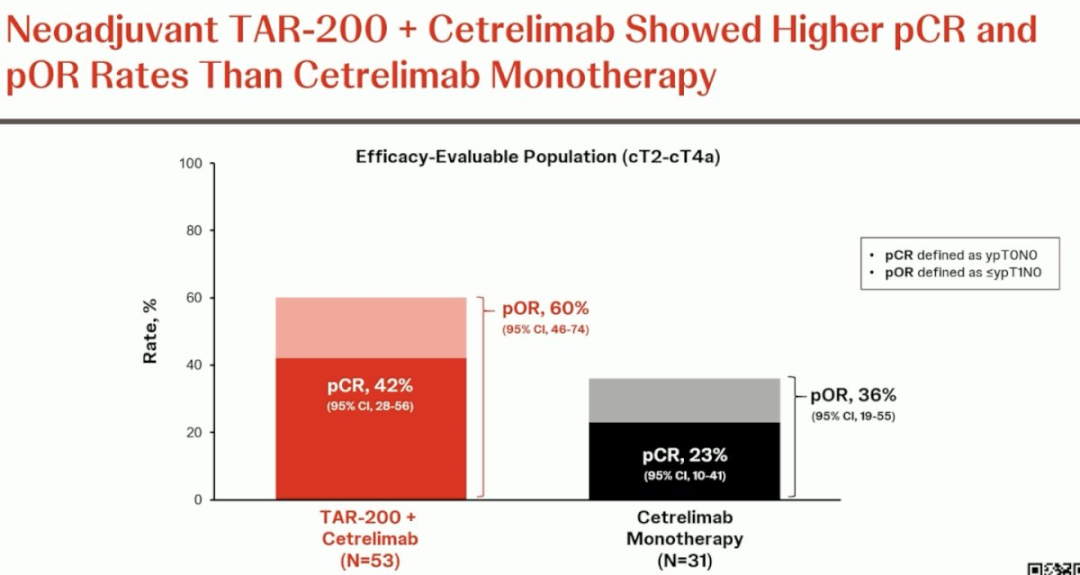 2024年ESMO大会报道了TAR-200用于MIBC新辅助治疗的SUNRISE-4研究[15],入组患者术前接受4个周期的TAR-200膀胱内治疗联合Cetrelimab静脉注射治疗,或者单独Cetrelimab静脉注射治疗,然后接受根治性手术并继续术后随访。研究结果显示,TAR-200+Cetrelimab组和Cetrelimab组确认的病理完全缓解(pCR,ypT0N0)率分别为42%和23%,总体病理缓解(pOR;≤ypT1N0)率分别为60%和36%。TAR-200+cetrelimab和cetrelimab分别有72%和44%患者出现治疗相关不良事件(TRAE),其中大多为1-2级。