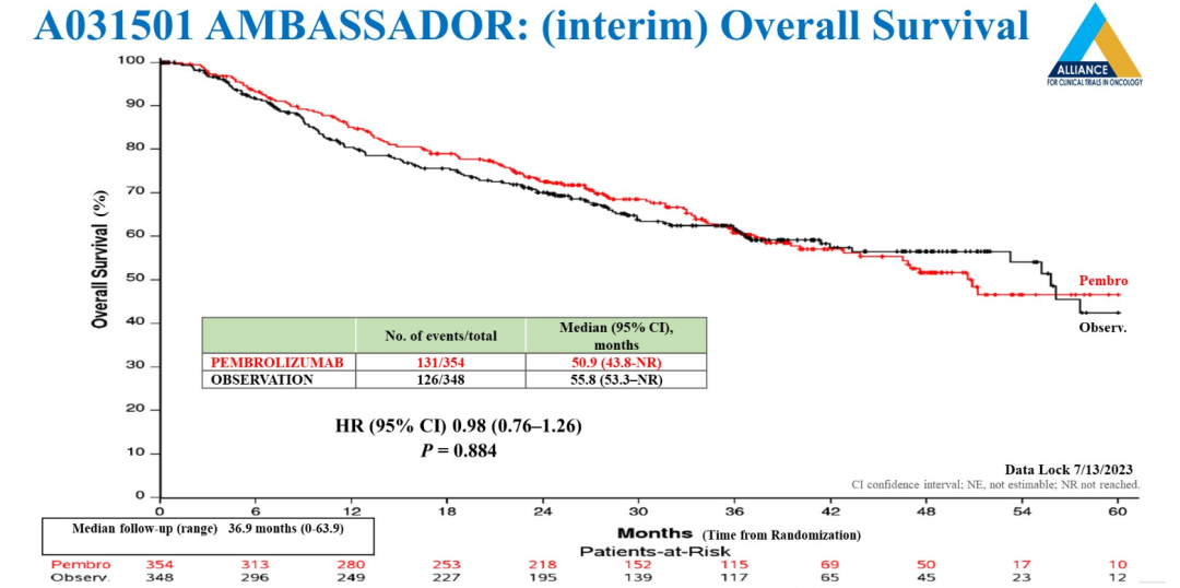 AMBASSADOR研究是另一个ICI辅助治疗MIBC的III期研究。该研究入组患者为新辅助化疗后≥pT2和/或pN+/切缘阳性,以及不适合或拒绝新辅助化疗的≥pT3和/或pN+/切缘阳性患者,术后接受帕博利珠单抗或安慰剂辅助治疗1年。2024年ASCO-GU大会报道达到了研究的主要终点之一DFS:帕博利珠单抗组和对照组的中位DFS分别为29.0个月和14.0个月(HR 0.69,95%CI 0.54~0.87,P=0.001)。但另一个主要终点OS尚无显著差异(50.9 vs 55.8个月,HR 0.98,95%CI:0.76~1.26;P=0.883)[10]。