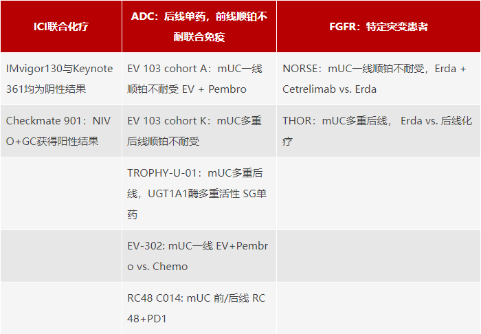 在转移性尿路上皮癌(mUC)领域,既往IMvigor130与KEYNOTE-361的阴性结果,为ICI联合化疗的应用蒙上一层“阴影”,但此后仍有更多免疫联合治疗模式的探索,包括联合化疗、ADC治疗以及FGFR靶向治疗等。