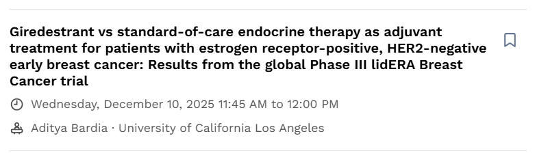 会议联合主席之一、德克萨斯大学健康科学中心的Virginia Kaklamani教授首先发表热情洋溢的欢迎辞。她指出,每年SABCS会议都会带来乳腺癌研究领域的诸多亮点,今年也不例外。众多转化研究项目、临床试验,尤其是具有开创性的临床试验将在会上呈现。其中,两周前才确定入选的lidERA研究备受关注,作为首个纳入本次会议口头报告的口服选择性雌激素受体降解剂(SERD)辅助治疗的试验,其结果于10日上午在大会“General Session 1”环节公布。