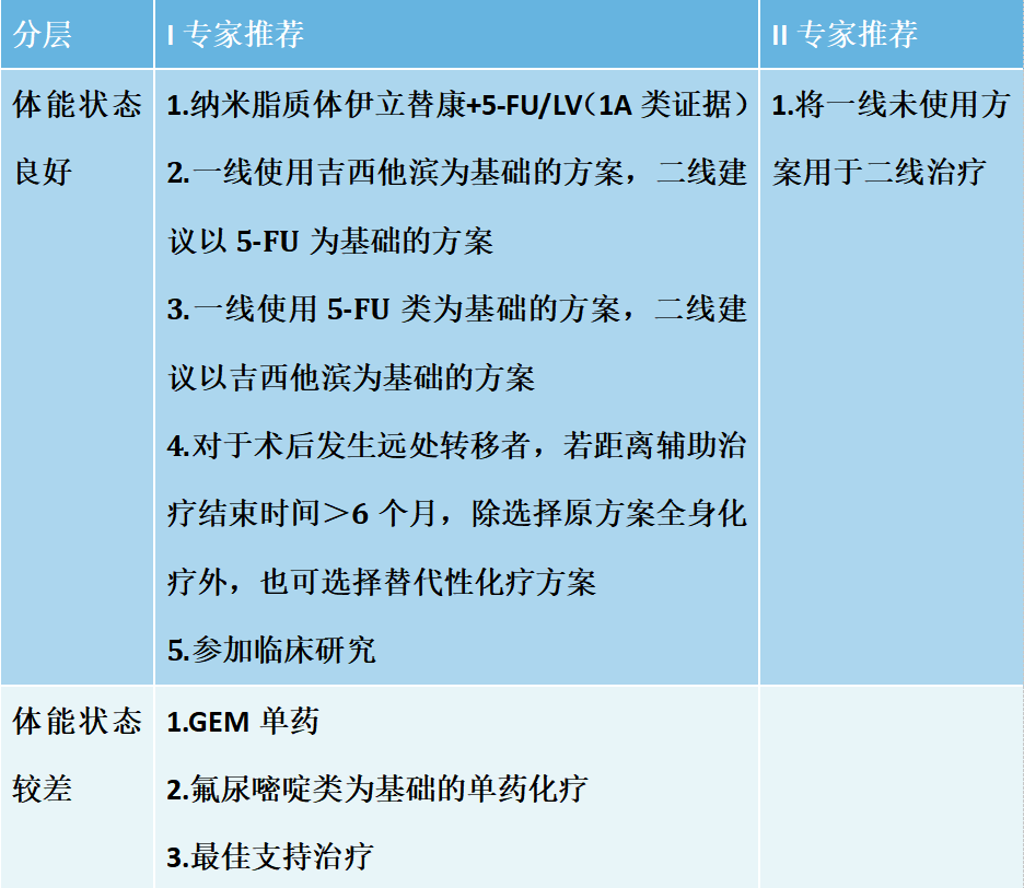 基于NAPOLI-1整体人群及亚洲人群的积极数据,2020年CSCO指南已将nal-IRI+5-FU/LV调整为Ⅰ级推荐,1A类证据,这也是目前二线治疗中推荐级别和证据等级最高、最明确的,其他的推荐方案均在nal-IRI+5-FU/LV之后,且没有明确的证据等级[5](见下表)。