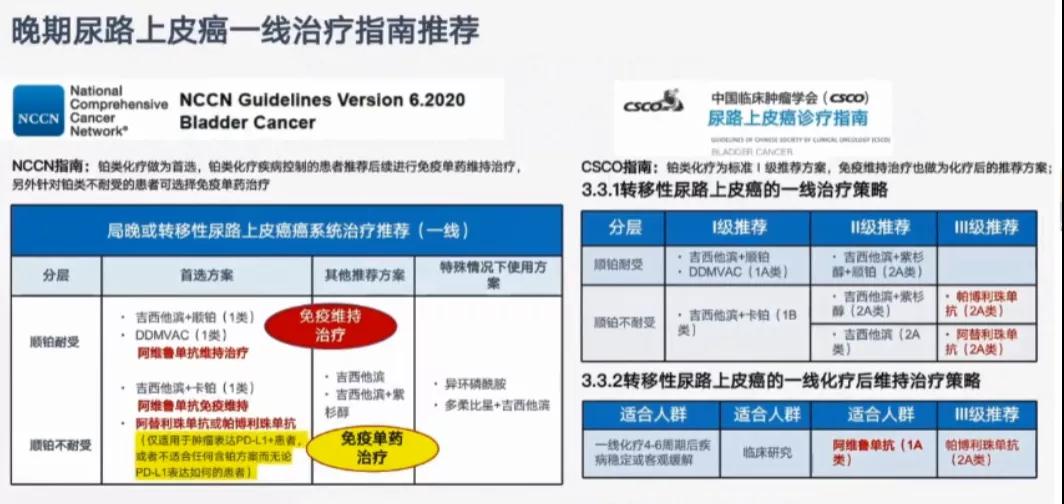 目前,NCCN指南对局晚期或转移性UC一线治疗的推荐中,顺铂耐受患者的首选方案包括GCis、ddMVAC的化疗选择,以及阿维鲁单抗的免疫维持治疗;顺铂不耐受患者的首选方案则包括GCarb化疗以及阿替利珠单抗或帕博利珠单抗等单独免疫治疗(PD-L1阳性或不适合任何含铂方案则无论PD-L1表达)。CSCO-UC指南有相似的推荐,但结合国内情况不同方案的推荐级别有所不同。