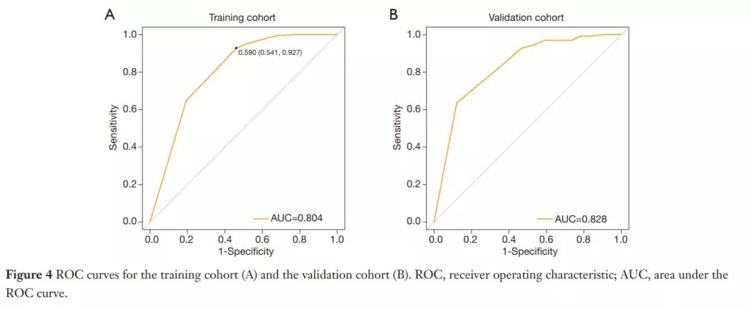 此外基于乳腺癌患者的临床病理特征开发的预测ER表达状态的诺模图对于ER弱阳性乳腺癌的精准治疗也同样具有指导意义。对多种临床病理特征进行多变量逻辑回归分析,结果显示与ER表达相关的独立因素包括核异型性(P=0.0339)、核分裂象(P=0.0022)、TILs(P<0.001)、以及坏死(P=0.0007)。以此建立的诺模图在预测概率和实际概率之间具有较好的一致性,AUC均高于0.80,具有良好的预测精度;通过计算约登指数得出该模型预测ER表达状态的cut-off值为0.59。