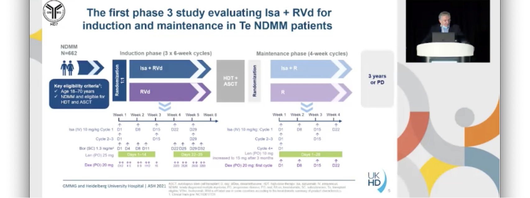 编者按:来那度胺联合硼替佐米及地塞米松(RVd)是新诊断多发性骨髓瘤(NDMM)使用最多的联合方案之一。在刚刚结束的2021美国血液学会(ASH)年会上,德国学者报道了一项多中心III期临床试验——GMMG-HD7,比较了CD38单抗(Isatuximab)联合RVd方案在适合移植的NDMM患者中的初步疗效(大会摘要号:463),获得了广泛关注。本刊特邀请首都医科大学附属北京朝阳医院陈文明教授对该项研究进行了精彩点评。