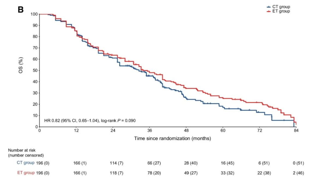 中位随访30.2(IQR 15.0~44.7)个月,内分泌治疗组和化疗组的中位PFS分别为19.2个月和14.8个月,达到非劣效性(HR 0.88,95%CI:0.71~1.09,非劣效P<0.0001)。内分泌治疗组和化疗组的中位OS分别为33.9个月和32.5个月(HR 0.82,95%CI:0.65~1.04,非劣效P=0.094)。
