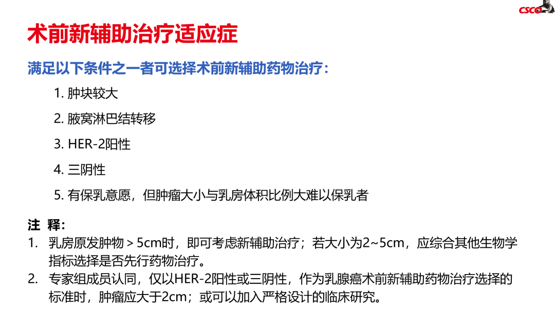 新辅助治疗适应症以需求为导向(局部治疗/全身治疗需求),通过新辅助治疗降期缩瘤、提高保乳/保腋窝率、提供药敏信息以指导后续治疗策略。