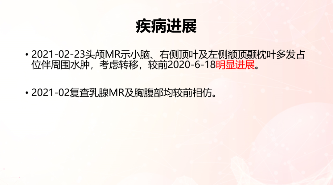 林颖教授:该患者目前有颅内进展,颅外状况需要进一步了解。如果该患者原本的肝转移控制的非常好,此时我们可有两种选择。首先,根据指南来说,脑转移主要是局部治疗,如果全脑多发转移,则更倾向于保护海马体的全脑放疗,此时,全身治疗方案是否一定要更改为二线,还需要结合颅外的情况。如果颅外非常稳定,我认为不需要更改为二线的全身治疗方案。如果颅外也有进展,基于中国国情会更多的考虑更改为TKI+化疗方案。此外,T-DM1也是一个不错的选择。但在KATHERINE研究中可以看到,T-DM1和曲妥珠单抗对于颅内进展患者的DFS获益没有太大差别。另外,对于晚期单纯脑转移患者,由闫敏教授牵头的著名的PERMEATE研究显示出TKI具有非常好的疗效,而T-DM1的疗效似乎不那么确切。