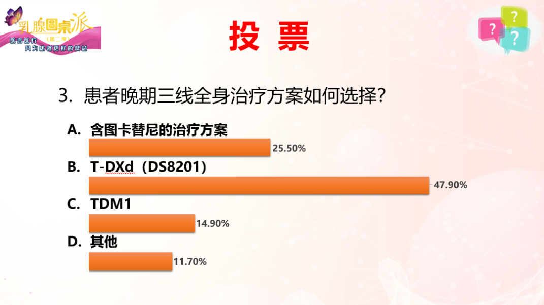 网上医生投票结果揭晓:绝大部分网上医生投票建议DS-8201,也有不少同行建议含图卡替尼的治疗方案。