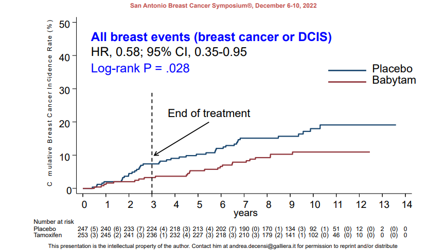 前期一项Ⅲ期试验表明,在中位随访5.1年的非浸润性乳腺癌切除的人群中(包括非典型导管增生、DCIS或LCIS),持续3年每天服用5 mg他莫昔芬,可以将浸润性乳腺癌或DCIS的复发率降低52%。他莫昔芬组每天仅多出一次潮热,与安慰剂组相比,毒性可以忽略不计。这些发现因可降低乳腺癌风险而被纳入ASCO临床实践指南,作为非侵袭性乳腺癌患者的标准治疗和持续使用他莫昔芬或芳香酶抑制剂治疗的替代方案。