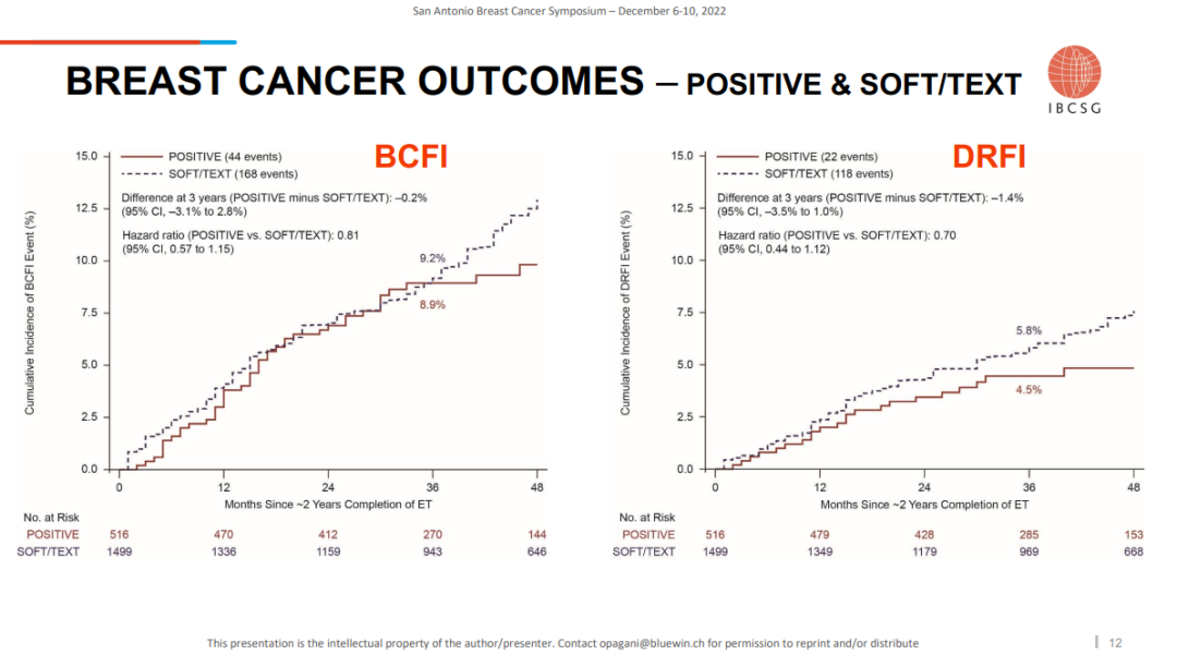 研究计划入组500例患者,时间跨度为2014年到2019年,包括了20个国家的116个中心,因为该类型患者较少,需要更多中心的支持。从乳腺癌诊断到入组的中位时间为29个月,中位随访为41个月。入组患者<35岁为34%,35~39岁为43%,40~42岁为23%。其中75%的入组人群未进行生育,因为从未生育患者的生育愿望会更强;21%的入组人群已经有过一个小孩,4%的患者已经有两个或以上。47%的患者为Ⅰ期,47%的患者为Ⅱ期,而Ⅲ期患者仅占6%。单独使用雌激素受体调节剂占到42%,使用OFS联合SERM类药物占到36%,还有16%使用OFS联合AI。62%的患者结束化疗(新辅助或辅助)。55%入组人群进行了保乳手术,45%进行了切乳手术。中位随访41个月时,发生了44例乳腺癌相关事件,占比8.9%。另外,发生远处转移事件22例,占比4.5%。本研究结果与类似年龄的SOFT/TEXT的研究人群对比,无乳腺癌事件时间(BCFI)和无远处转移事件时间(DRFI)无明显差异。