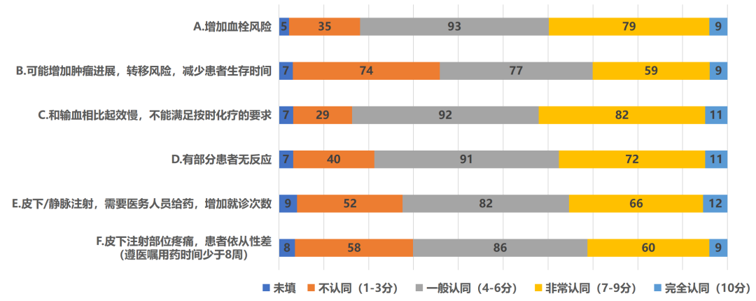 在327份有效问卷中,有32.4%(n=106)的受访者所在科室从未使用ESA进行CIA治疗。在这106份有效问卷中,认为造成未使用ESA纠正贫血的主要原因(注:本次调研中的观点排序是根据选项得分、问卷总数和总得分进行权重排序的)是:“ESA在当前科室不可及”、“和输血相比起效慢,不能满足按时化疗的要求”、“增加肿瘤患者血栓风险”。三甲医院受访者非常认同“ESA在当前科室不可及”的比例低于其他级别医院(38%vs 50%);而非常认同“和输血相比起效慢,不能满足按时化疗的要求”的比例高于其他级别医院(34%vs 29%)。