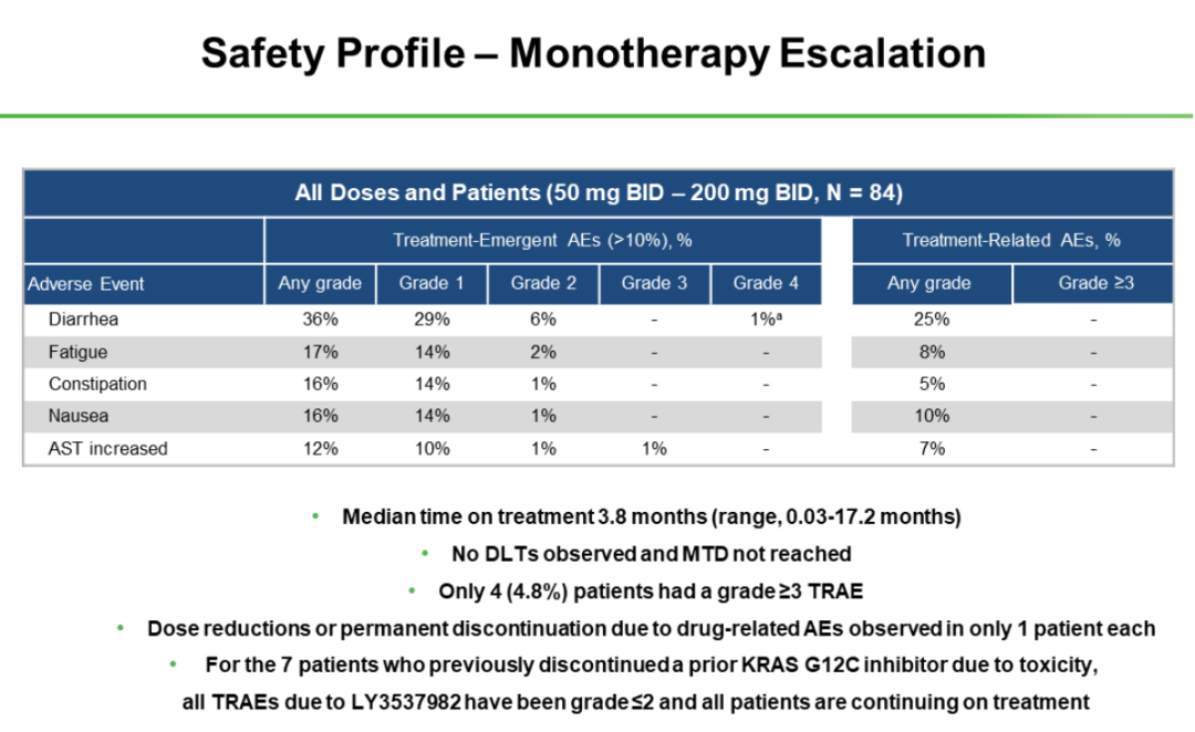 LY3537982单药:未观察到剂量限制性毒性(DLT)。在所有剂量水平组,任何级别的治疗中发生的不良事件(TEAE)包括腹泻(36%)、疲劳(17%)、便秘(16%)、恶心(16%)和天冬氨酸转氨酶升高(AST;12%),大多是1级事件,以上几种TEAE分别有6%、2%、1%、1%和1%为2级;1例3级AST和1例4级腹泻归因于CT扫描中的造影剂不耐受。任何级别的治疗相关AE(TRAES)如下:腹泻(25%)、疲劳(8%)、便秘(5%)、恶心(10%)和AST升高(7%)。Murciano-Goroff说:“总的来说,LY3537982单药治疗可耐受,由于药物相关的不良事件(AE)而减量或永久停药的情况很少发生(各有1例)。有趣的是,在单药治疗队列中有7例患者之前接受KRAS G12C抑制剂治疗因毒性停药,在本试验中只发生≤2级TEAE,至数据截止时,所有7例患者仍在接受治疗。”