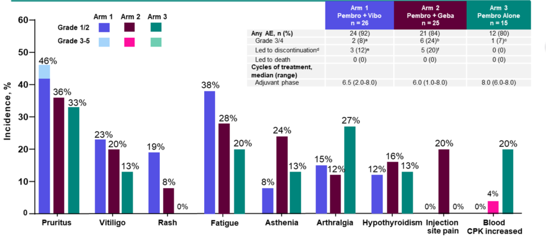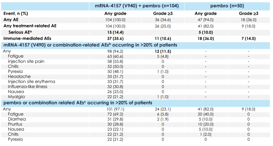 两组的总体安全性数据相当(下图第一栏),但联合组≥3级治疗相关不良事件(TRAEs)略高于单免组(25%vs 18%),mRNA疫苗以乏力、注射部位疼痛/红肿、寒战/发热等为主,但大多为1-2级事件(下图第二栏);mRNA疫苗联合帕博单抗主要增加了乏力、腹泻发生率(下图第三栏)。