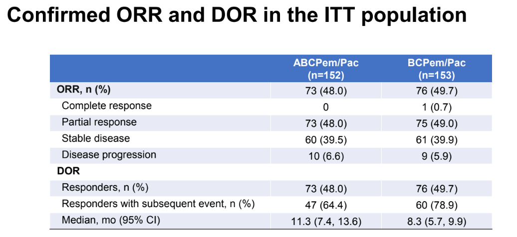 在ITT人群中,两组的ORR分别为48%和49.7%,DOR分别为11.3和8.3个月。