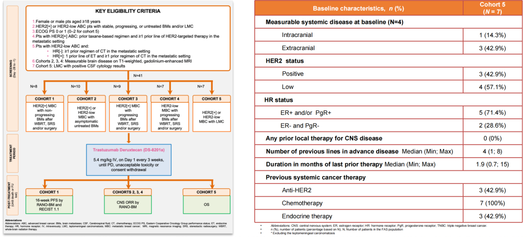 2021年4月14日-2022年4月5日,队列5纳入7例患者。中位年龄为57岁(范围,42岁-69岁),3例(42.9%)患者为HER2[+],6例(85.7%)患者同时患有颅外转移,其中2例(28.6%)出现BM,3例(42.9%)患者患有的疾病在可控范围内。晚期病变的既往治疗方案的中位数为4(范围,1-8),无患者接受与中枢神经系统相关的既往局部治疗。在数据截止日期(2023年4月4日),中位随访时间为12个月(范围,2.5-18.6)。治疗持续时间的中位数为9.0个月(范围,2.1-18.6)。2例(28.6%)患者仍在接受治疗:1例HER2+和1例HER2-low患者分别在18.6个月和12.0个月后接受治疗。中位OS为13.3个月(95%CI,5.7-NA,P<0.001),达到主要终点。在5例疾病进展的患者中,无1例颅内进展。共有4例(57.1%)患者出现颅外进展,1例(14.3%)患者出现临床恶化。未观察到客观反应,但7例患者中有5例出现较长时间的疾病稳定(≥24周),总体CBR为71.4%(95%CI,29.0-96.3),RECIST v.1.1的中位PFS为8.9个月(95%CI,4.9-NA)。非血液学治疗相关不良事件(TEAEs)的任何等级(G)中,最常见的是恶心(57.1%;14.3%G3)、疲劳(42.9%;0%G3)、呕吐(42.9%;0%G3)、头痛(42.9%;0%G3)和尿路感染(42.9%;0%G3)。其中,贫血(42.9%;0%G3)和血小板减少(28.6%;14.3%G3)是最常见的血液学TEAEs。未报告肺间质病/肺炎病例。7例患者中有4例(57.1%)发生与治疗无关的严重TEAEs,1例发生与治疗相关的严重TEAE(恶心G3)。未报告治疗相关的死亡。