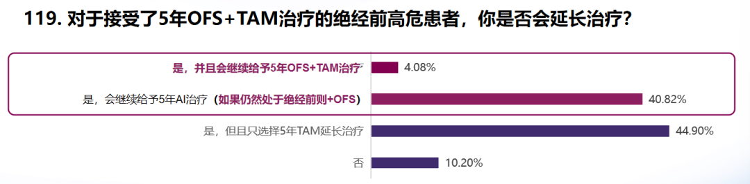 那么,随着治疗延长,绝经前换着是否需要同时延长OFS?2021年St.Gallen专家共识投票中,有近一半(44.9%)专家认为延长治疗同样需要联合OFS[5]。