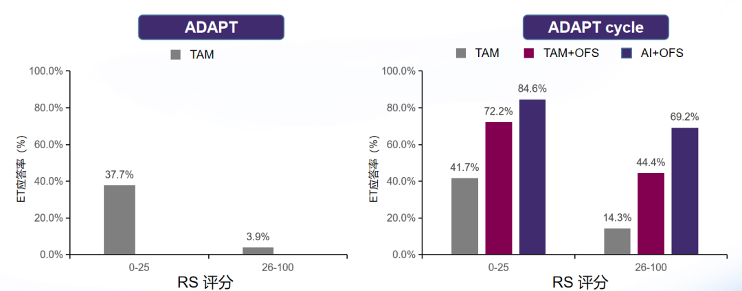 这两项研究还分析了年龄≤50岁临床中高风险HR+患者,OFS+Al可获得最大化的内分泌治疗应答率,尤其是ADAPT cycle研究中,不论其复发评分是否>25,年龄≤50岁HR+患者AI联合OFS均可获得最大化的内分泌治疗应答率。在年龄≤40岁的患者中,其复发评分为0~25时,AI+OFS组的内分泌治疗应答率高达近85%,即便在复发评分25分以上组中AI+OFS内分泌治疗应答也显示出69.2%,而单用他莫昔芬却只有3.9%。