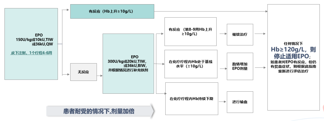而对于血红蛋白(Hb)<6 g/dL的患者,需要输血同时给予促红细胞生成素(EPO)治疗(图1)。共识推荐[1],Hb≤10 g/dL时即可起始EPO治疗;而如果Hb超过12 g/dL,则需要根据患者的个体情况减少EPO剂量或者停止使用EPO。原则上,Hb<8 g/dL时,不建议肿瘤患者进行化疗治疗。