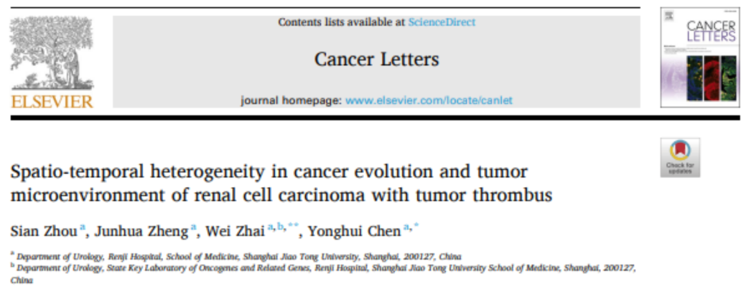 转移是癌症最为致命的特征之一,在发生转移之前,肿瘤通常会侵袭血管系统并在其中形成癌栓。肾癌合并静脉癌栓(RCC-TT)具有高度的手术复杂性、较高的疾病进展风险和不良预后,成为了严峻的临床挑战。然而,针对RCC-TT的治疗模式面临着重重障碍。这些障碍源自肿瘤内外的高度异质性、患者个体化治疗差异以及原发肿瘤和癌栓之间不同的耐药模式。基于此,上海交通大学医学院附属仁济医院郑军华及陈勇辉团队深入探讨总结了RCC-TT的独特时空进化轨迹,以及RCC-TT侵袭模式与肿瘤分期分级之间的关联和RCC-TT独特的肿瘤微环境成分的功能表型,为针对RCC-TT的未来转化研究及临床全局管理办法提供了重要参考。